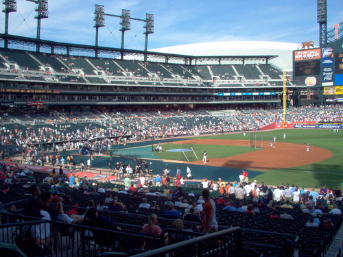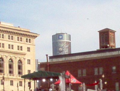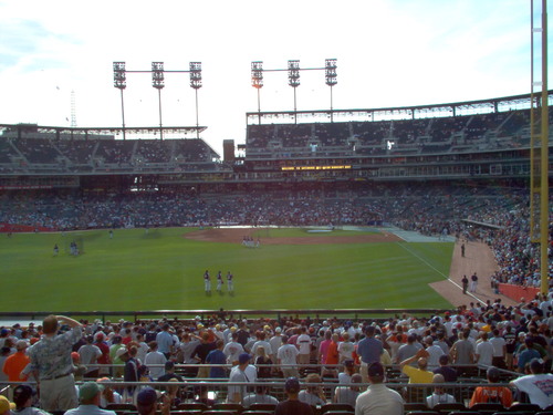 THe Ren Cen beyond the outfield wall was decorated with a simulated baseball crashing into the building.