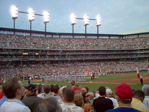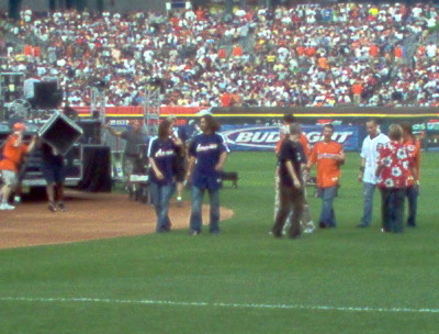 Johnny Damon walking off the field after appearing on stage with Alter Bridge, the pregame entertainment.