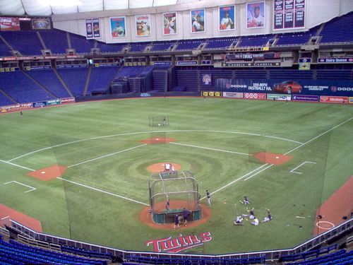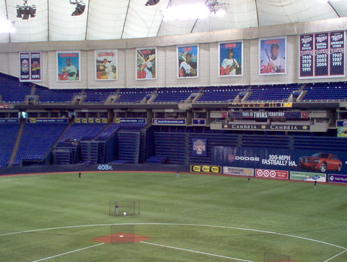 Above the right field seats, the retired numbers of former Minnesota Twins displayed on a huge white curtain.